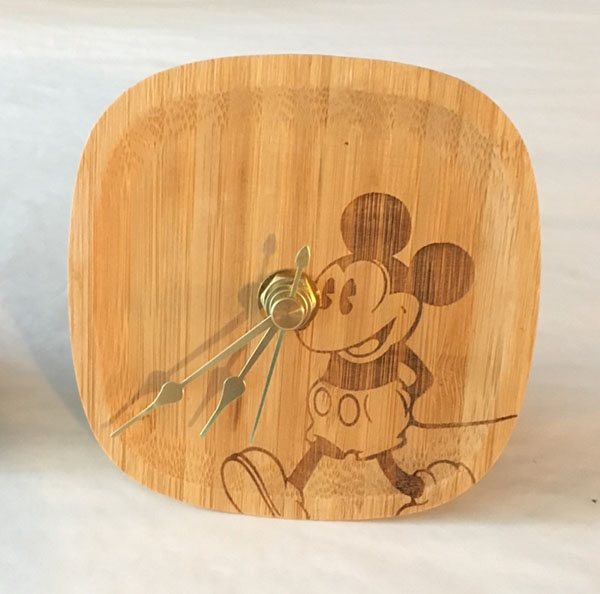 | Disney Mickey Mouse Waving Bamboo Desk Desktop Clock These are adorable Mickey desk clocks. Each one has a different pose. You can see the texture of the bamboo on it. This clock is a beautiful addition to your home. It measures 4" x 4". The clock movement has a loop on the top so you can hang it on a wall or can sit on a table with the small plastic piece as shown in the photo. The plastic piece is inserted in the edge of the battery compartment with the battery. It is brand new. | $31.99 |