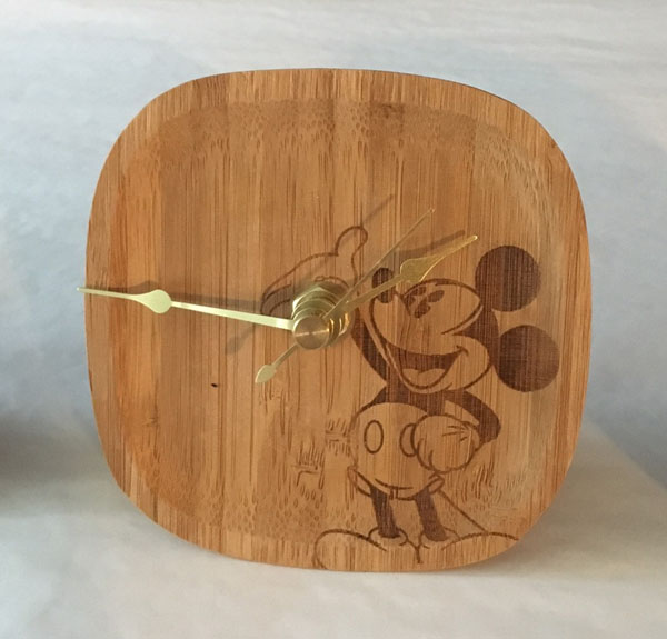 | Disney Mickey Mouse w/ Hands on Hips Bamboo Desk Desktop Clock These are adorable Mickey desk clocks. Each one has a different pose. You can see the texture of the bamboo on it. This clock is a beautiful addition to your home. It measures 4" x 4". The clock movement has a loop on the top so you can hang it on a wall or can sit on a table with the small plastic piece as shown in the photo. The plastic piece is inserted in the edge of the battery compartment with the battery. It is brand new. | $31.99 |