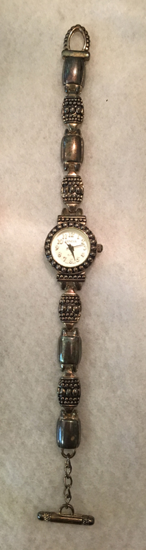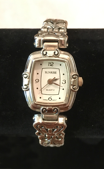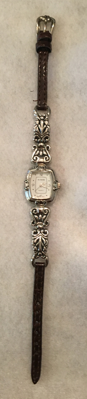 | Ladies Brightonish Sunrise Beautiful Silver Tone Embellished Quartz Watch This is a beautiful silver tone embellished Ladies watch by Sunrise. It has a beautiful rectangular face embellished with a silver tone swirling design. The face casing measures 3/4 inch x 1 inch. The band is a thin brown leather with a silver tone buckle. This is not a Brighton watch, but looks like one. | $21.99 | ![]() | |