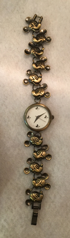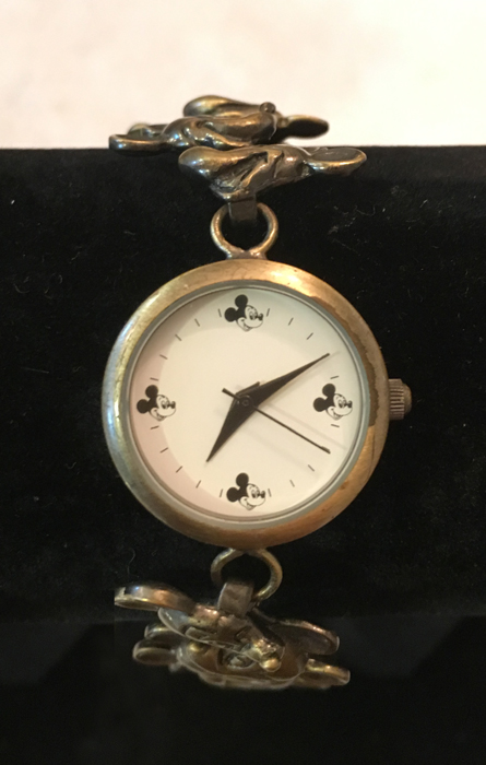 sDisney Ladies Antique Gold Tone Watch w/Gold Mickey Heads Band This Disney Mickey Mouse women's watch is a beautiful addition to your Disney watch collection. It is an antique gold with a white face with little Mickey heads at the 12, 3, 6, and9. The band is all 3D Mickey heads. The face measures 1" in diameter. It is 6.5" long. It is new, but there is a mark on the side of the crystal on the casing. It shows in the photos. |