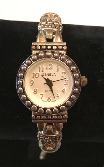 | Ladies Beautiful Geneva Fancy Silver Tone Embellished Quartz Watch This is a beautiful silver tone embellished ladies watch by Geneva. It has a beautiful round face embellished with a silver tone beads. The face casing measures a little over 3/4 inch across. The band is a silver tone bracelet. | $14.99 |