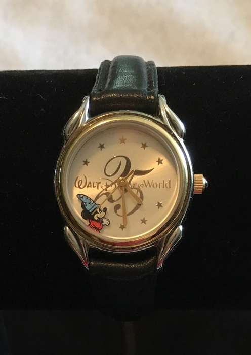 | LE Disney Mickey Mouse Walt Disney World 25th Anniversary 2 Tone Women's Watch This Disney Limited edition Mickey Mouse women's watch was made exclusively for Walt Disney World 25th Anniversary and is a numbered limited edition number 1830/3000. It's a beautiful addition to your Disney watch collection. It is battery operated, with a stainless steel case back. It has a silver case with gold around the face. It says Walt Disney World 25 in gold in the middle and has silver stars around the top and bottom. Sorcerer Mickey is at the 7 & 8 spot looking to the center. The band is leather. The face measures 1" in diameter. Excellent condition. | $97.99 |